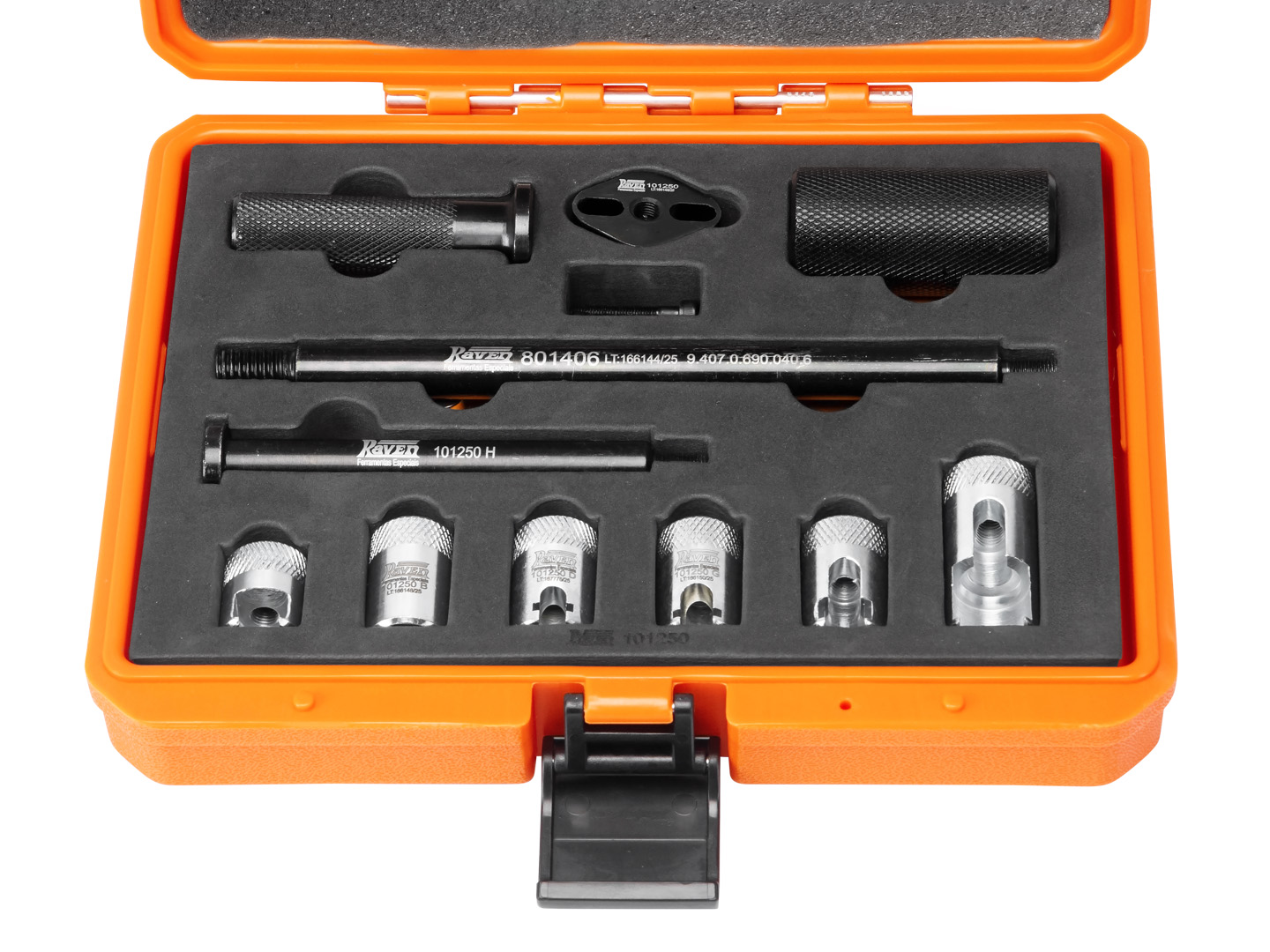 Código: 101250Nome: Conjunto de extratores (à percussão) de injetores de combustível "GDI" de motores ciclo Otto equipados com injeção direta.<ul><li>Acompanha 7 adaptadores.</li><li>Produto fornecido em 1 estojo plástico especial com interior em EVA.</li><li>Composição:</li><li>1 - Cabo longo com 220 mm e duas roscas (801406-00B).</li><li>1 - Cabo curto com 130 mm, rosca e batente, para injetores localizados em pontos de difícil acesso (101250-00H).</li><li>1 - Manopla para o cabo longo com 80 mm, rosca, batente e acabamento recartilhado (801406-00E).</li><li>1 - Peso deslizante com 0,52 kg e acabamento recartilhado (801406-00C).</li><li>1 - Adaptador com abertura de 6,8 / 10,5 mm para injetores dos motores Ford 2.0 16V turbo EcoBoost, Hyundai 1.0 12V (3 cils.) turbo T-GDi Kappa II (F3LC) e VW / Audi EA211 1.0 12V (3 cils.) turbo TSI / 170 TSI / 200 TSI e 1.4 16V turbo TSI / 250 TSI / TFSI / 35 TFSI (101250-00D).</li><li>1 - Adaptador com abertura de 8,2 / 12,6 mm para injetores de motores Renault 1.0 12V SCe (3 cils.) (B4D HS / LS) (101250-00G).</li><li>1 - Adaptador curto com abertura de 9,8 / 13,5 mm para injetores dos motores Fiat / Stellantis GSE 1.0 12V (3 cils.) MultiAir turbo T200 e 1.3 16V MultiAir turbo T270 (101250-00C).</li><li>1 - Adaptador com abertura longa de 10,0 / 13,5 mm para injetores de motores Renault 1.0 12V (3 cils.) turbo TCe (H5Dt) e Mercedes-Benz / Renault 1.3 16V turbo TCe (M282 / H5Ht) (101250-00F).</li><li>1 - Adaptador longo com abertura longa de 15,8 / 19,3 mm para injetores de motores Mercedes-Benz (101250-00E).</li><li>1 - Adaptador com rosca M12 x 1,5 mm para injetores dos motores BMW 2.0 16V turbo (N20), 3.0 24V 6 cils. em linha turbo / biturbo (N54 / N55) e 4.4 32V V8 biturbo (N63) (101250-00B).</li><li>1 - Adaptador com dois furos oblongos (e 2 parafusos) para injetores dos motores GM Ecotec 1.4 16V turbo (LE2) e 1.5 16V turbo (LYX) e motores BMW 1.2 12V (3 cils.) TwinPower Turbo (B38), 1.5 12V (3 cils.) TwinPower Turbo (B36 / B38), 2.0 16V TwinPower Turbo (B46 / B48) e 3.0 24V (6 cils. em linha) biturbo (B58 / S58) (131021-00C).</li></ul>Família: MotorPeso: 3,9 Kg |
