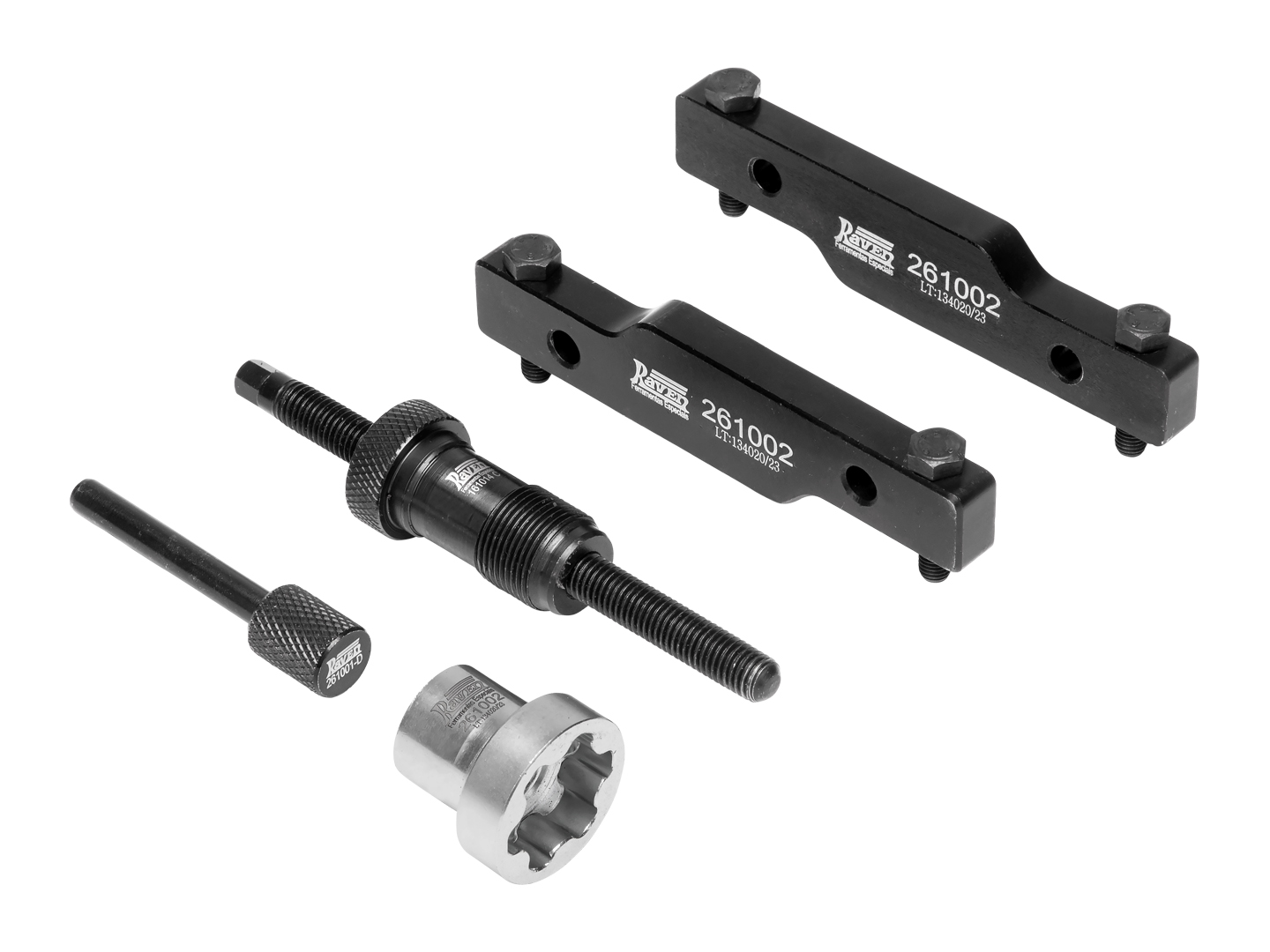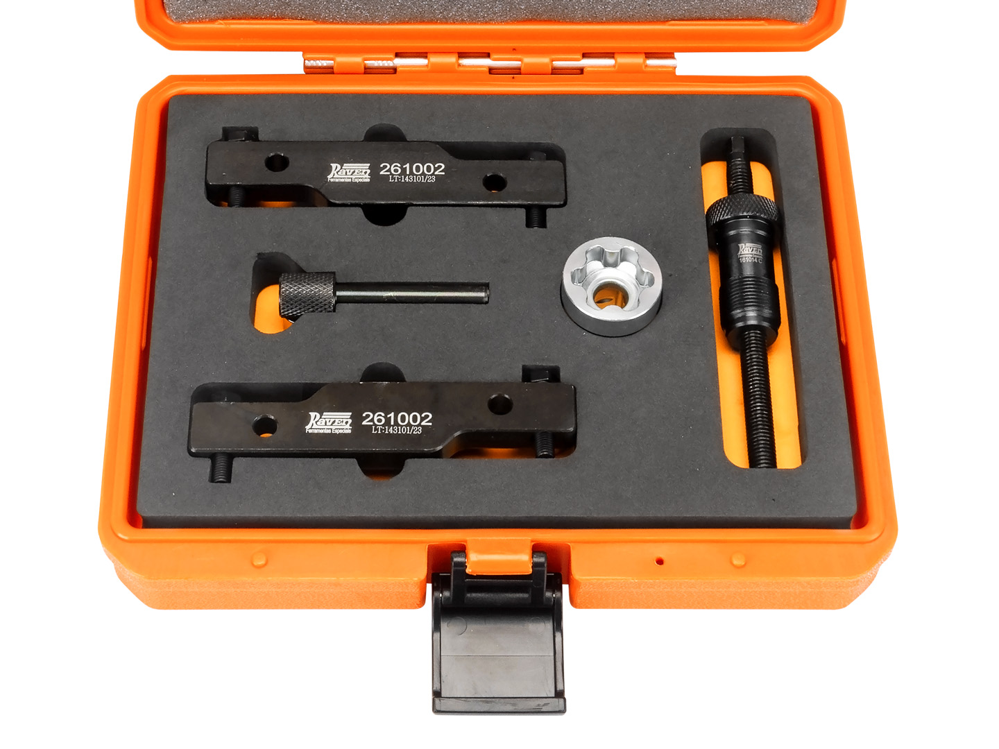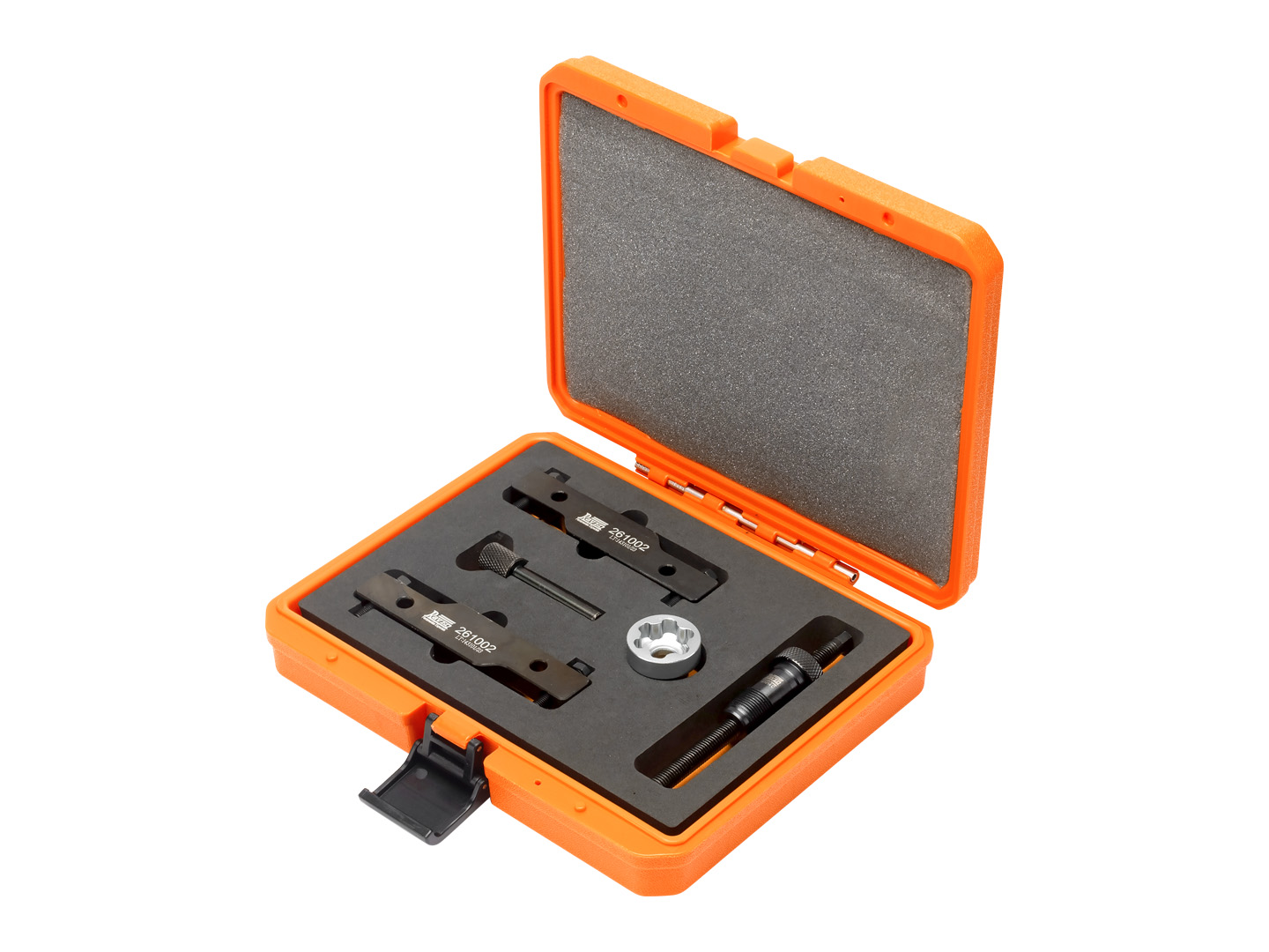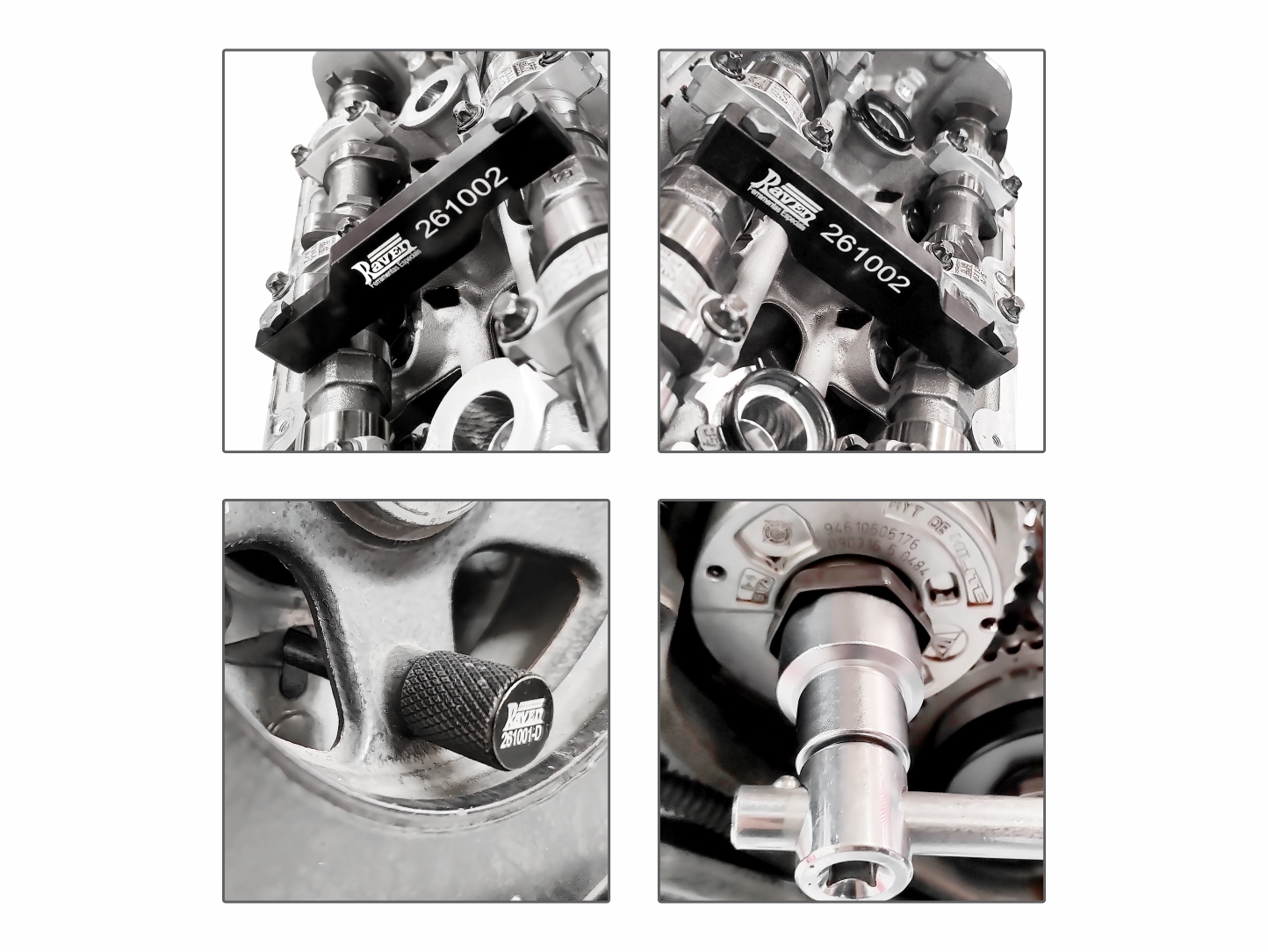 Código: 261002Nome: Conjunto com 5 ferramentas para sincronismo.<ul><li>Aplicação:</li><li>Motores Porsche 3.0 / 3.6 24V V6 biturbo (M46 2ª ger.), aplicados em veículos Porsche (13-18), incluindo.</li><li>a) 3.0 24V V6 biturbo (M46.60 / CWDA / CWFA / MCW.DA) aplicados no Porsche Panamera S 1ª ger. (970) (13-16).</li><li>b) 3.0 24V V6 biturbo (M46.30 / CTMA / MCT.MA) aplicados no Porsche Macan S 1ª ger. (95B) (14-18).</li><li>c) 3.0 24V V6 biturbo (DCNA / MDC.NA) aplicados no Porsche Macan GTS 1ª ger. (95B) (15-18).</li><li>d) 3.6 24V V6 biturbo (M46.35 / CTLA / MCT.LA) aplicados no Porsche Macan Turbo 1ª ger. (95B) (14-18).</li><li>e) 3.6 24V V6 biturbo (M46.55 / CURA / MCU.RA) aplicados no Porsche Cayenne S 2ª ger. (92A) (15-17).</li><li>f) 3.6 24V V6 biturbo (CXZA / MCX.ZA) aplicados no Porsche Cayenne GTS 2ª ger. (92A) (15-18).</li><li>Produto fornecido em um estojo plástico especial.</li><li>Composição:</li><li>Par de ferramentas para posicionar as árvores de comando (com 4 parafusos), pino para posicionar a árvore de manivelas (através da polia), ferramenta para tensionar a corrente durante o aperto dos parafusos / válvulas das engrenagens das árvores de comando e soquete E32 com encaixe de 1/2", para os parafusos / válvulas das engrenagens das árvores de comando.</li><li>Nos motores Porsche 3.6 V6 aspirado (M46 1ª ger.) (que possuem variador de fase somente na admissão), utilize o conjunto 261001.</li><li>Manual Incluso.</li></ul>Família: MotorPeso: 1,6 Kg |