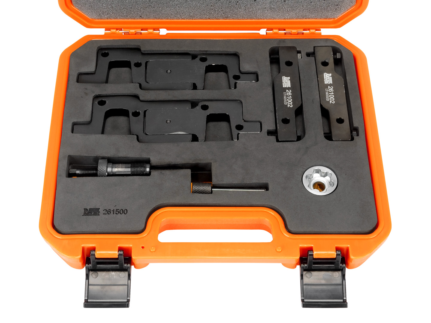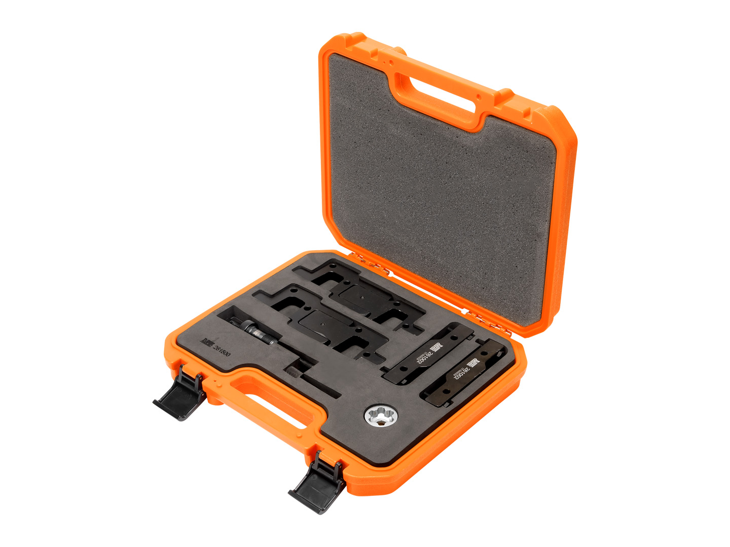 Código: 261500Nome: Conjunto com 7 ferramentas para sincronismo.<ul><li>Aplicação:</li><li>Motores Porsche 3.0 24V V6 biturbo (M46 2ª ger.), 3.6 24V V6 aspirado (M46 1ª ger.), 3.6 24V V6 biturbo (M46 2ª ger.), 4.8 32V V8 aspirado (M48) e 4.8 32V V8 biturbo (M48).</li><li>Aplicação veículos Porsche.</li><li>Cayenne S 1ª ger. (9PA) 4.8 32V V8 (M48.01) (07-10).</li><li>Cayenne S 2ª ger. (92A) 4.8 32V V8 (M48.02) (10-14).</li><li>Cayenne S 2ª ger. (92A) 3.6 24V V6 biturbo (M46.55 / CURA / MCU.RA) (15-17).</li><li>Cayenne GTS 1ª ger. (9PA) 4.8 32V V8 (M48.01) (07-10).</li><li>Cayenne GTS 2ª ger. (92A) 4.8 32V V8 (M48.02) (12-14).</li><li>Cayenne GTS 2ª ger. (92A) 3.6 24V V6 biturbo (CXZA / MCX.ZA) (15-18).</li><li>Cayenne Turbo 1ª ger. (9PA) 4.8 32V V8 biturbo (M48.51) (07-10).</li><li>Cayenne Turbo 2ª ger. (92A) 4.8 32V V8 biturbo (M48.52 / CFTB) (10-18).</li><li>Cayenne Turbo S 1ª ger. (9PA) 4.8 32V V8 biturbo (M48.51) (07-10).</li><li>Cayenne Turbo S 2ª ger. (92A) 4.8 32V V8 biturbo (M48.52 / CYXA) (10-18).</li><li>Macan S 1ª ger. (95B) 3.0 24V V6 biturbo (M46.30 / CTMA / MCT.MA) (14-18).</li><li>Macan GTS 1ª ger. (95B) 3.0 24V V6 biturbo (DCNA / MDC.NA) (15-18).</li><li>Macan Turbo 1ª ger. (95B) 3.6 24V V6 biturbo 2ª ger. (M46.35 / CTLA / MCT.LA) (14-18).</li><li>Panamera 1ª ger. (970) 3.6 24V V6 (M46.20 / CWAA / CXNA) (10-16).</li><li>Panamera 4 1ª ger. (970) 3.6 24V V6 (M46.40) (10-13).</li><li>Panamera S 1ª ger. (970) 4.8 32V V8 (M48.20) (09-13).</li><li>Panamera S 1ª ger. (970) 3.0 24V V6 biturbo (M46.60 / CWDA / CWFA / MCW.DA) (13-16).</li><li>Panamera 4S 1ª ger. (970) 4.8 32V V8 (M48.40) (09-13).</li><li>Panamera GTS 1ª ger. (970) 4.8 32V V8 (M48.40 / CXPA / CXRA) (12-16).</li><li>Panamera Turbo 1ª ger. (970) 4.8 32V V8 biturbo (M48.70 / CWBA) (09-16).</li><li>Panamera Turbo S 1ª ger. (970) 4.8 32V V8 biturbo (M48.70 / CWCA) (12-16).</li><li>Produto fornecido em uma maleta plástica especial.</li><li>Composição:</li><li>Par de ferramentas (com 4 parafusos) para posicionar as árvores de comando dos motores 3.0 / 3.6 V6 (M46 2ª ger.), par de ferramentas para posicionar as árvores de comando dos motores 3.6 V6 (M46 1ª ger.) e 4.8 V8 (M48), pino para posicionar a árvore de manivelas (através da polia), ferramenta para tensionar a corrente durante o aperto dos parafusos / válvulas das engrenagens das árvores de comando e soquete E32 com encaixe de 1/2", para os parafusos / válvulas das engrenagens das árvores de comando dos motores 3.0 / 3.6 V6 (M46 2ª ger).</li><li>Manual Incluso.</li></ul>Família: MotorPeso: 3,5 Kg |