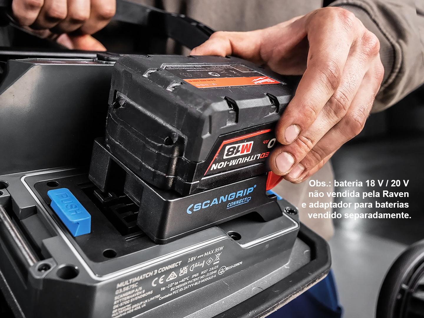 036148C - Adaptador Scangrip Connect para conectar baterias 18 V / 20 V de ferramentas elétricas Makita (não vendidas pela Raven) ao refletor Multimatch 3 Connect (035675C).|Possui sistema para proteção da bateria, com proteção automática contra descargas, proteção contra sobrecarga e monitoramento da temperatura da bateria.