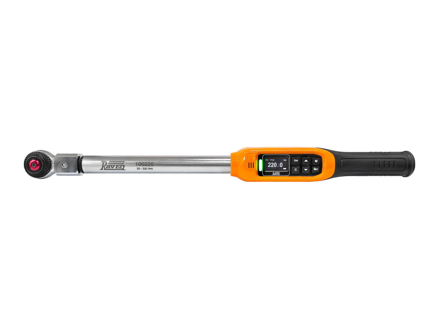 Código: 100220Nome: Torquímetro Digital (torque e ângulo) intercambiável (para insertos 14x18 mm), com capacidade de 20 a 220 Nm. Acompanha chave catraca reversível 14x18 mm com encaixe de 1/2". Aplica torque nominal e/ou torque angular em 6 Modos de Operação diferentes, possui memória e emite alertas visuais, sonoros e vibração no cabo durante e após a aplicação do torque desejado. Produto fornecido em um estojo plástico especial.<ul><li>Características / Diferenciais:</li><li>a) Um dos únicos torquímetros digitais equipados com encaixe para insertos 14x18 mm,</li><li>b) Chave catraca reversível 14x18 mm com encaixe de 1/2", engrenagem de 72 dentes e botão para encaixe / liberação rápida dos soquetes (King Tony 34503204R),</li><li>c) Faixa de Operação de 20 a 220 Nm (praticamente a capacidade dos torquímetros 100300 e 100400 somadas),</li><li>d) Exatidão de +/- 2%,</li><li>e) 4 unidades de medida: Nm, Lbf.ft, Lbf.in e Kgf.m mais aperto em ângulo,</li><li>f) 6 Modos de Operação: Torque Livre, Pico de Torque, Torque Programado, Ângulo Programado, Torque + Ângulo Programados e o exclusivo Modo Montagem,</li><li>g) Modo Torque + Ângulo Programados: aplica torque nominal e torque angular em sequência (alternando automaticamente para torque angular ao atingir o toque nominal programado), mostrando a soma dos torques aplicados no final do aperto,</li><li>h) Exclusivo Modo Montagem: ideal para quando se precisa aplicar o(s) mesmo(s) torque(s) em um conjunto de até 30 parafusos ou porcas, com relatório no final dos apertos que mostra o torque exato aplicado em cada parafuso / porca e a variação entre o maior e o menor torque aplicados,</li><li>i) Função Catraca Automática: quando não é possível aplicar todo o torque programado de uma só vez, o 100220 soma os apertos parciais automaticamente,</li><li>j) Alertas visuais (LED verde / amarelo / vermelho), sonoros (alarmes contínuos ou intermitentes de diferentes intensidades) e táteis (cabo vibratório) que indicam a aproximação e obtenção do torque programado,</li><li>k) Armazena até 5 valores de torque nominal e 5 valores de torque angular na memória,</li><li>l) Sensores de sobrecarga e de queda,</li><li>m) Alimentação através de 2 pilhas AA.</li><li>n) Fornecido com certificado de calibração.</li></ul>Família: Controle de torquePeso: 2,45 Kg |