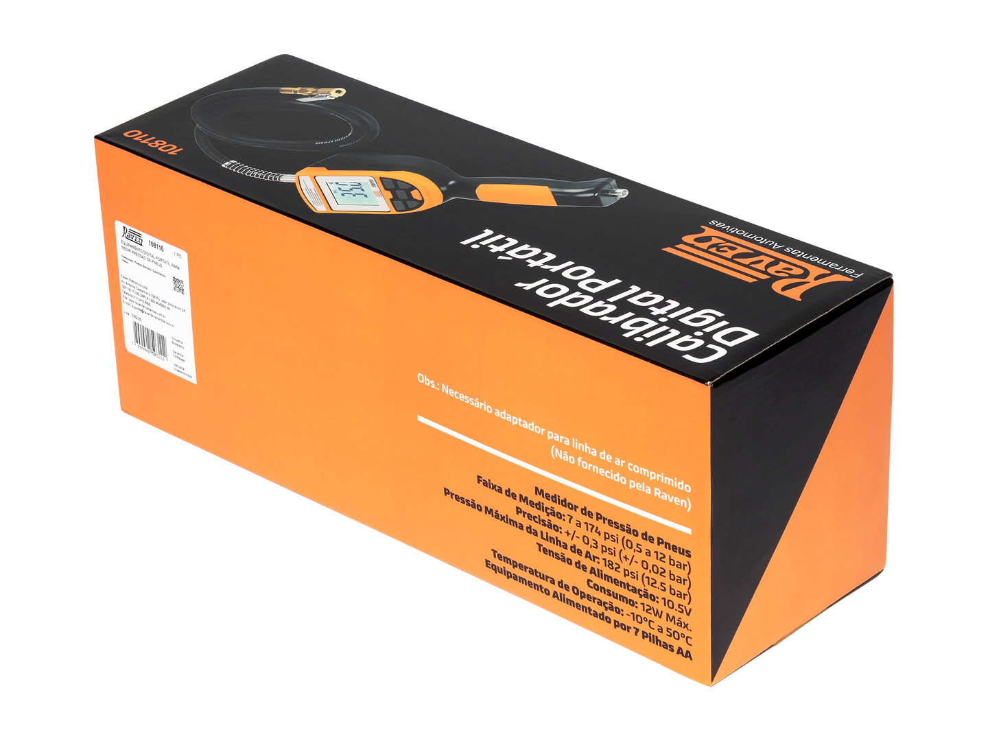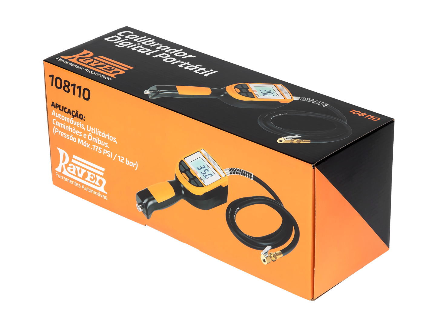 Código: 108110Nome: Calibrador de pneus eletrônico, automático e portátil.<ul><li>Aplicação:</li><li>Automóveis, utilitários, caminhões e ônibus.</li><li>Características / Diferenciais:</li><li>a) Injeta até 175 psi / 12 bar.</li><li>b) Precisão de +/- 0,02 bar / +/- 0,3 psi (equipamento calibrado individualmente).</li><li>c) Duas opções de unidades de medida: psi / bar.</li><li>d) Operação simples e funcionamento automático: ao ser conectado ao pneu, o 108110 mostra a pressão presente no mesmo, e basta selecionar o valor de pressão desejado e apertar o botão Start para iniciar a pressurização ou despressurização do pneu.</li><li>Ao atingir a pressão definida, o calibrador interrompe automaticamente a calibração e emite sinais sonoros.</li><li>e) Memória: possibilita deixar um valor de pressão salvo na memória do equipamento, e esse valor de pressão aparece como padrão toda vez que o calibrador é ligado.</li><li>f) Função OPS (Over Pressure Setting): assenta o pneu na roda injetando a pressão de trabalho do pneu mais um valor adicional de pressão, e em seguida automaticamente desinfla o pneu até a pressão de trabalho.</li><li>g) Carcaça em ABS com formato ergonômico e acabamento parcialmente emborrachado.</li><li>h) Display LCD com caracteres grandes e luz azul de fundo.</li><li>i) Mangueira em borracha com 1,8 m, conexão metálica roscada e bico para enchimento.</li><li>j) Alimentação através de 7 pilhas AA (fornecidas), que proporcionam uma autonomia de 10 a 15 h de uso contínuo.</li><li>k) Sistema de economia de energia, que desliga automaticamente o calibrador após 90 segundos de inatividade.</li><li>l) Também compatível com nitrogênio.</li><li>Necessário adaptador para linha de ar comprimido (não fornecido pela Raven).</li><li>Manual incluso.</li></ul>Família: Suspensão DianteiraPeso: 1,6 Kg |