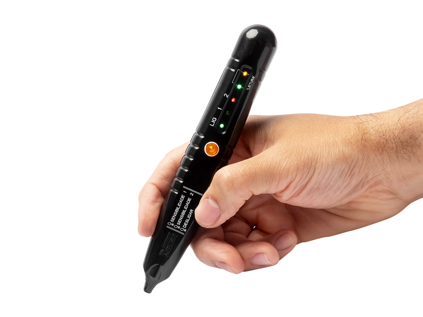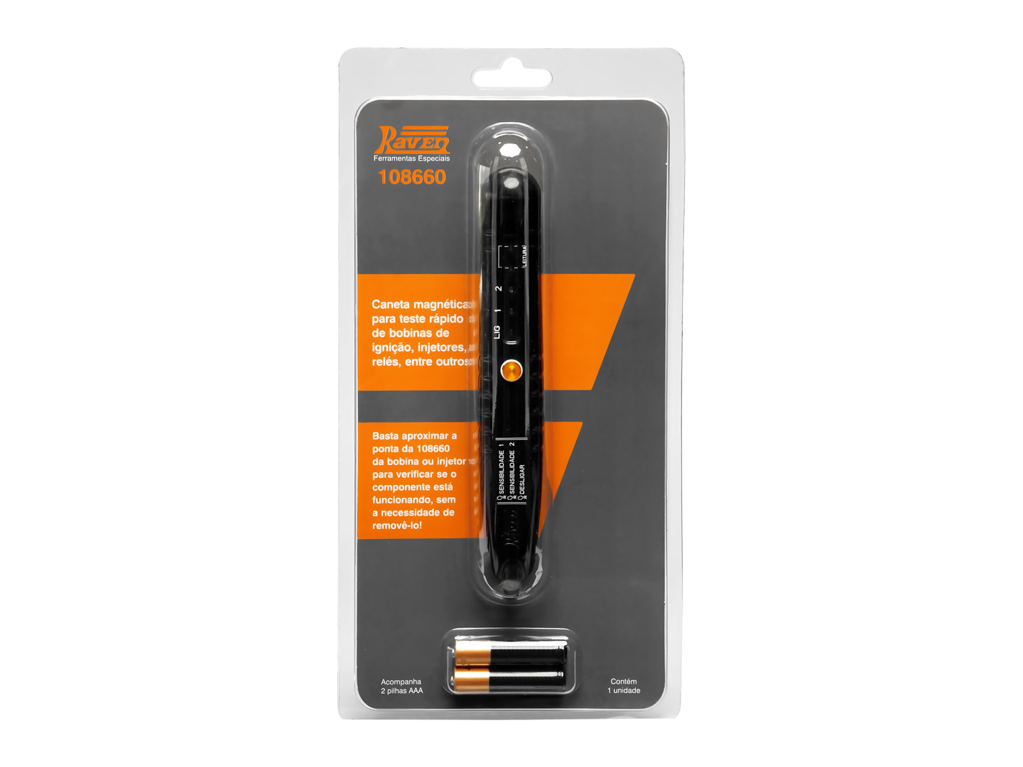Código: 108660Nome: Caneta magnética para verificação rápida do funcionamento de bobinas de ignição, injetores, rotores de alternadores, relés, solenóides, entre outros, sem necessidade de desmontagem.<ul><li>Características/Diferenciais.</li><li>a) Indica a presença e a intensidade de campos magnéticos através de 2 LEDs e sinais sonoros, bastando aproximar ou encostar a Iponta da caneta no componente a ser testado.</li><li>b) Sensor Hall de alta precisão com sensibilidade ajustável em 2 níveis.</li><li>c) LED dianteiro, que facilita o uso em pontos com pouca iluminação e / ou de difícil acesso.</li><li>d) Sistema de economia de energia, que desliga automaticamente a caneta após 20 segundos de inatividade.</li><li>e) Carcaça compacta, leve e com formato ergonômico.</li><li>f) Produto fornecido em um blister reaproveitável.</li><li>g) Acompanha duas pilhas AAA.</li></ul>Família: ElétricaPeso: 0,1 Kg |