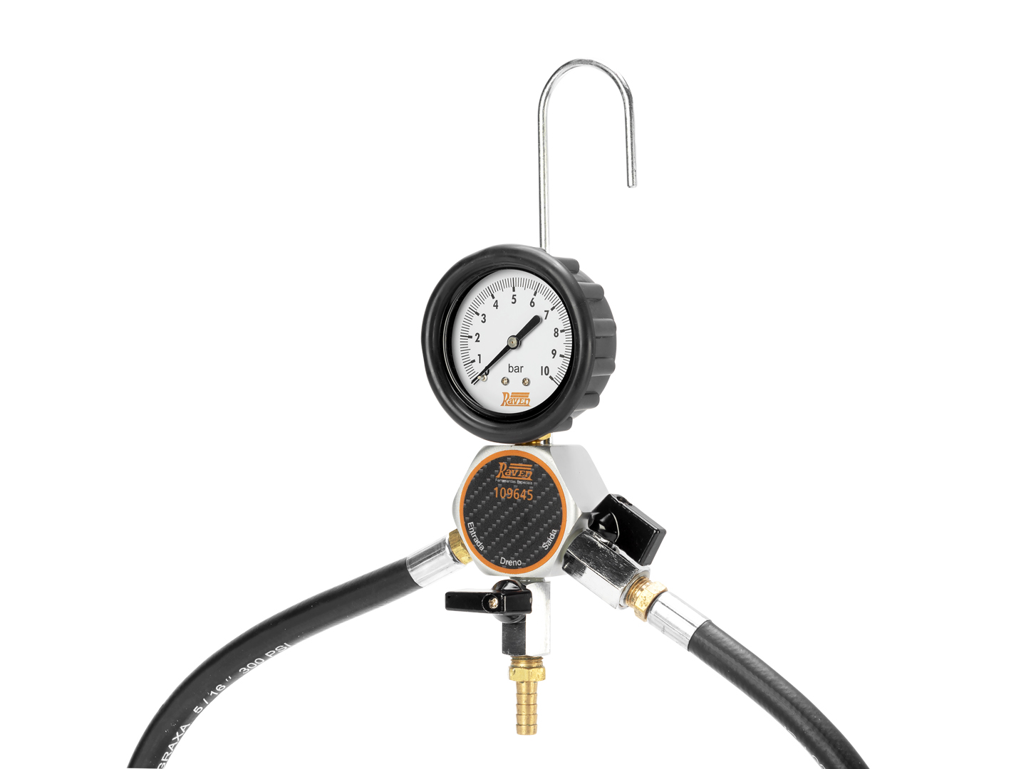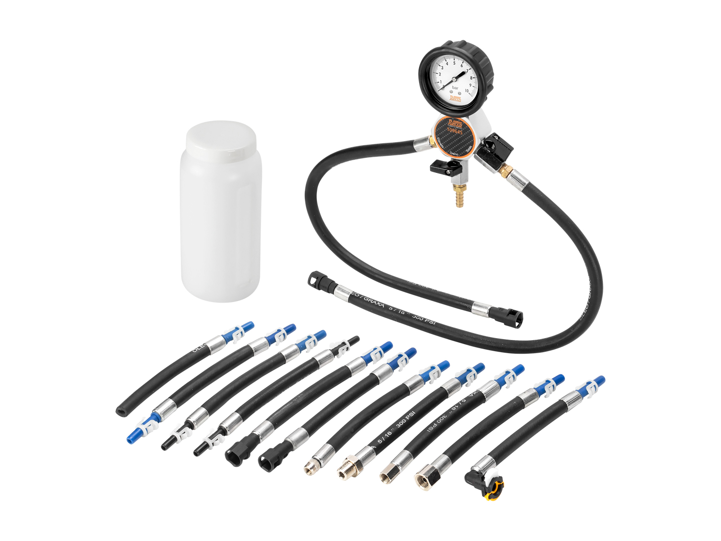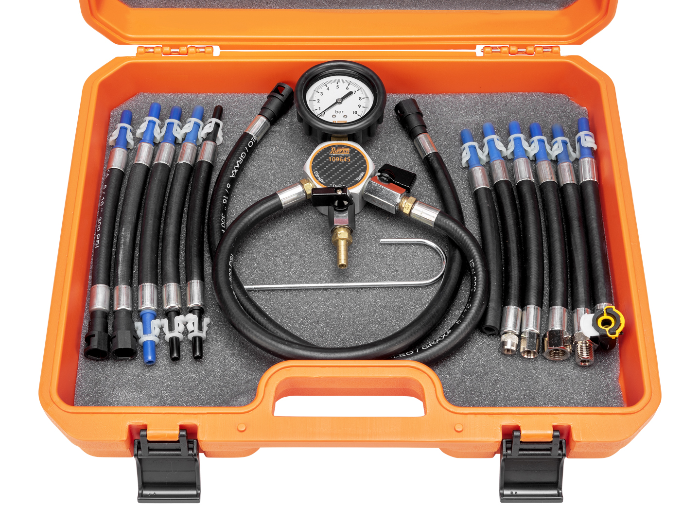 Código: 109645Nome: Equipamento para medir a pressão e a vazão de combustível de motores Ciclo Otto equipados com injeção eletrônica (de forma não simultânea).<ul><li>Possui 11 mangueiras adaptadoras.</li><li>Produto fornecido em uma maleta plástica especial grande.</li><li>Confira também o 109755.</li><li>Composição1 - Corpo de alumínio com manômetro classe "B" de 0 a 10 bar, seco (com sistema à prova de vibrações) e protegido por capa de borracha, duas mangueiras de borracha de 500mm com engate rápido tipo "Click" fêmea de 3/8", válvulas para saída e dreno de combustível e um gancho para pendurá-lo (109645-01).</li><li>1 - Mangueira curta com adaptador com válvula Schrader de 7 mm e engate rápido tipo "Click" (macho) de 3/8" (109645-05).</li><li>1 - Mangueira curta com adaptador com válvula Schrader de 10 mm e engate rápido tipo "Click" (macho) de 3/8" (109645-06).</li><li>1 - Mangueira curta com adaptador com rosca M14 (macho) e engate rápido tipo "Click" (macho) de 3/8" (109655-10).</li><li>1 - Mangueira curta com adaptador com rosca M14 (fêmea) e engate rápido tipo "Click" (macho) de 3/8" (109655-11).</li><li>1 - Mangueira curta com engate rápido tipo "Click" (fêmea) de 5/16" a 90° (para teste, entre outros, de veículos Peugeot) e engate rápido tipo "Click" (macho) de 3/8" (109645-02).</li><li>1 - Mangueira curta com uma extremidade livre e engate rápido tipo "Click" (macho) de 3/8" (109645-03).</li><li>1 - Mangueira curta com 2 engates rápidos tipo "Click" (macho) de 5/16" (109645-04).</li><li>1 - Mangueira curta com 2 engates rápidos tipo "Click" (macho) de 3/8" (109645-07).</li><li>1 - Mangueira curta com engate rápido tipo "Click" (macho) de 5/16" e engate rápido tipo "Click"(macho) de 3/8" (109655-14).</li><li>1 - Mangueira curta com engate rápido tipo "Click" (fêmea) de 5/16" e engate rápido tipo "Click" (macho) de 3/8" (109645-09).</li><li>1 - Mangueira curta com engate rápido tipo "Click" (fêmea) de 3/8" e engate rápido tipo "Click" (macho) de 3/8" (109645-08).</li><li>1 - Recipiente plástico graduado de 1l para coletar combustível (PRT5796).</li><li>Manual Incluso.</li></ul>Família: Arrefecimento e outrosPeso: 2,9 Kg |